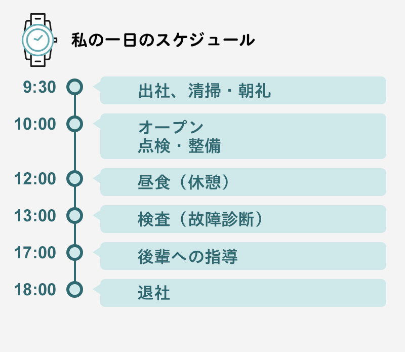 社内はいつも明るい雰囲気です。上司や同僚、後輩は、親しみやすい人ばかり。悩み事や相談事も親身になって聞いてくれます。整備の技術習得のための研修は独自のステップアップが用意されています。今後もブランドに恥じない高い品質のサービスを提供するため、日々努力を続けていきます。