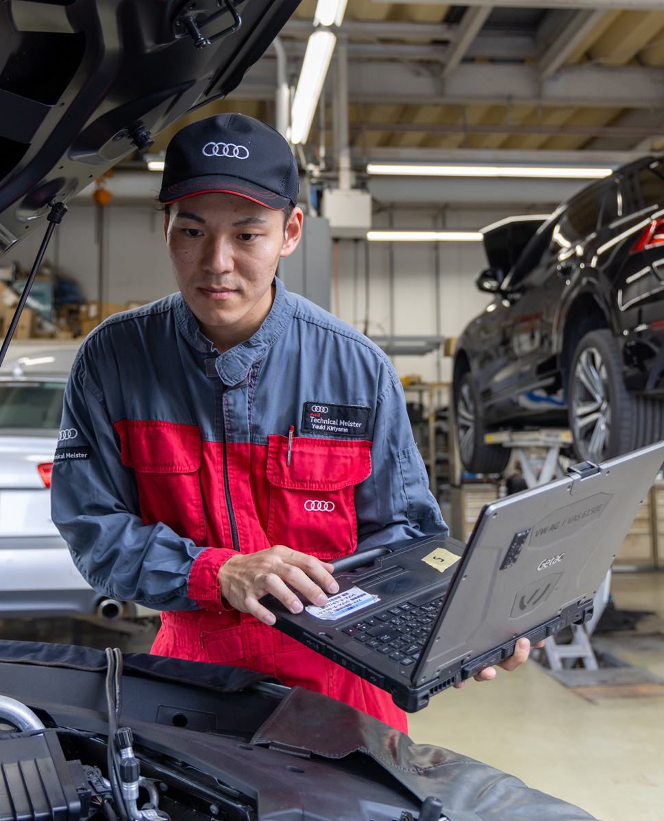 私はテクニカルマイスターを取得しました。世界中で高く評価されるAudiの、その複雑でありながら美しく調和したマシンと、最先端のテクノロジーに触れることは、クルマへの新たな感動を生み出します。一緒に成長を体験しませんか。テクニカルスタッフとして上を目指したい人は、ぜひお待ちしております。